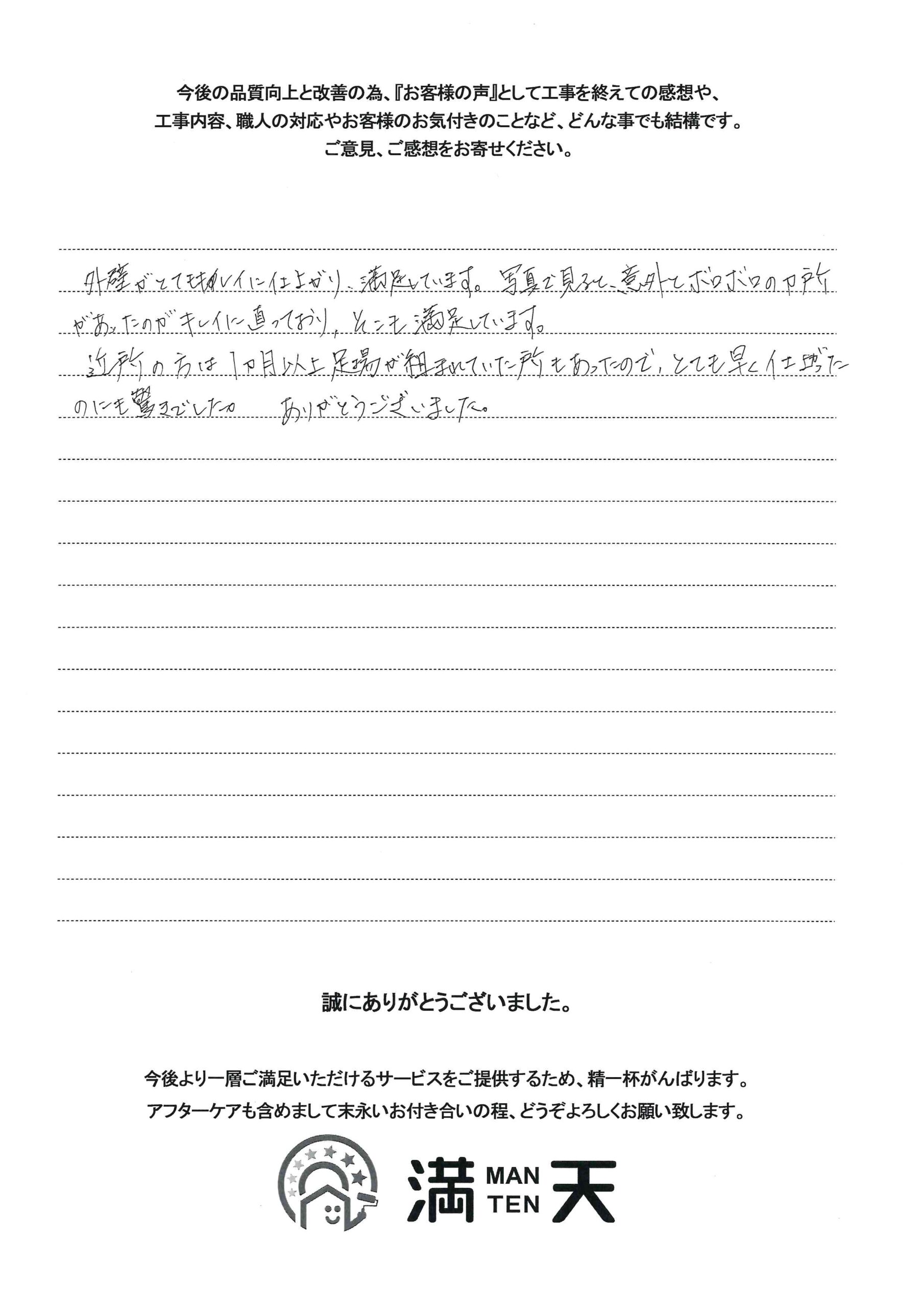 目線で対応して頂いたことが嬉しかったです。満天さんにして本当に良かったです。(新潟市西区 T様)