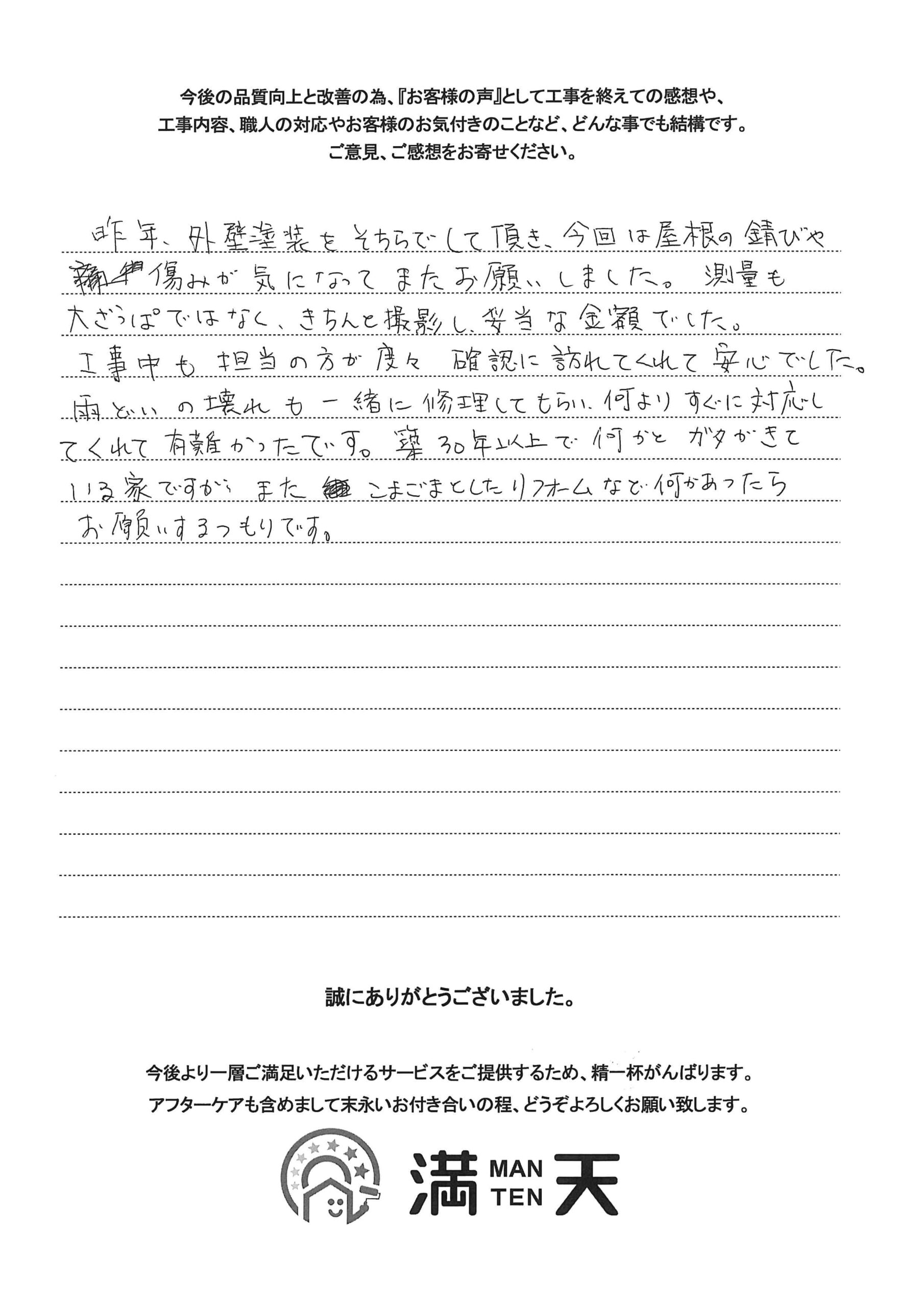 昨年、外壁塗装をそちらでして頂き、今回は屋根の錆や傷みが気になってまたお願いしました。
