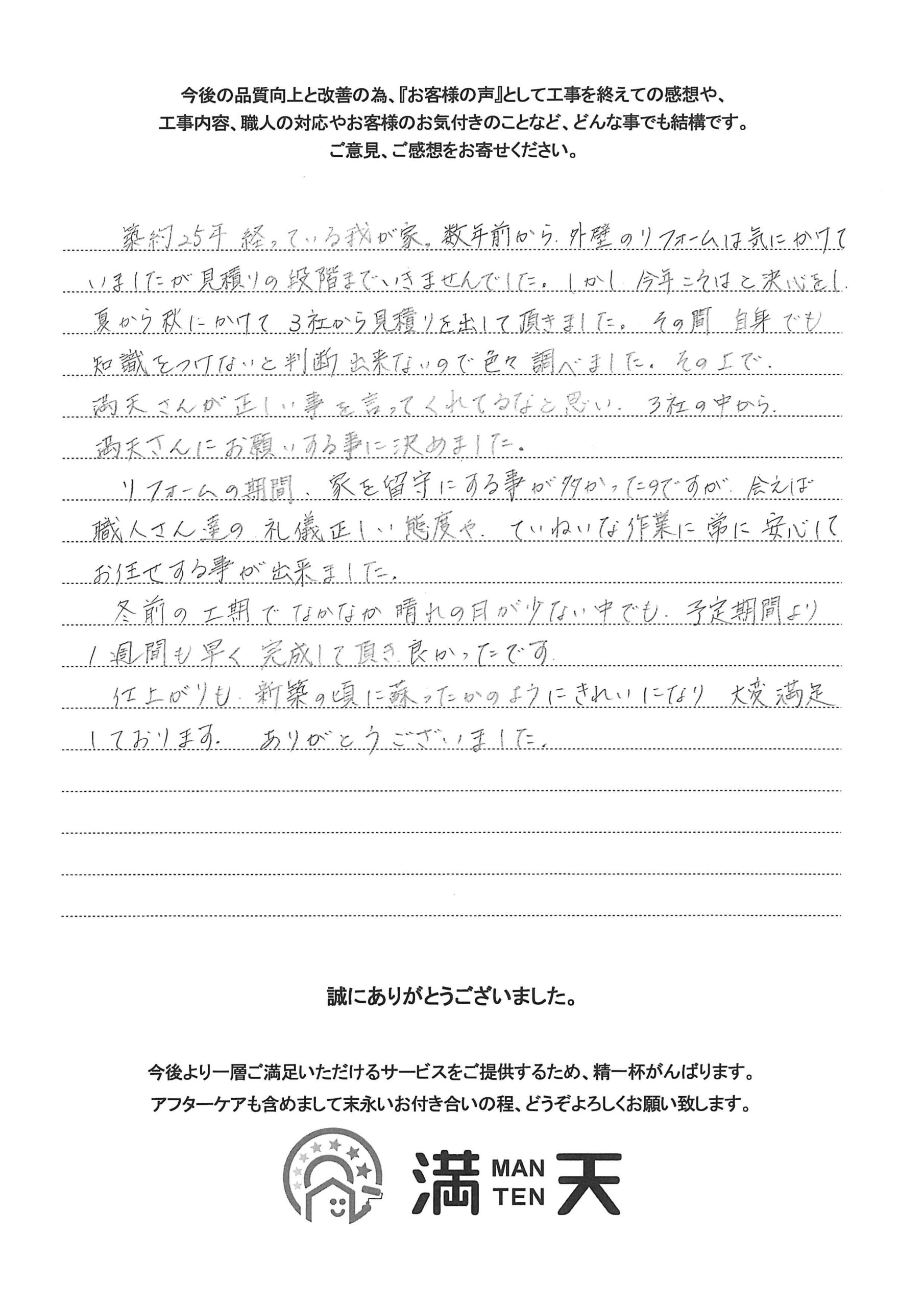数年前から外壁リフォームは気にかけていましたが見積りの段階までいきませんでした。